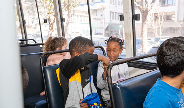 Des lignes de bus desservent le centre-ville et la périphérie. Un surveillant accompagne les enfants durant tout le trajet.